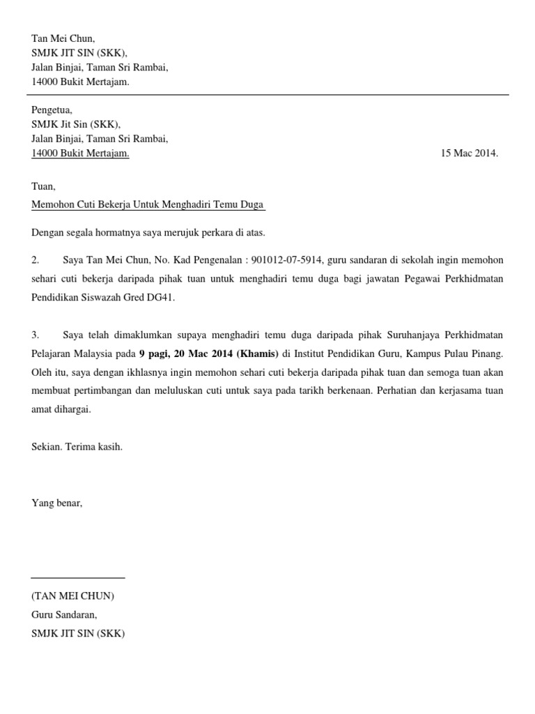 Terkenal dengan fokus dan penekanan kami. Surat rasmi permohonan cuti sekolah ini penting dalam memastikan rekod berhenti sekolah pelajar kelak berada dalam keadaan yang baik. Contoh Surat Rasmi Permohonan Cuti Kerja have an image associated with the otherContoh Surat Rasmi Permohonan Cuti Kerja In addition it will include a picture of a kind that may be seen in the gallery of Contoh Surat Rasmi Permohonan Cuti Kerja.